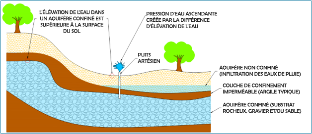 Image 4 - Schéma représentant les conditions artésiennes. Notez que le niveau des eaux souterraines dans l'aquifère captif est plus élevé que le niveau du sol au niveau du puits.