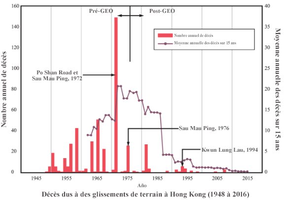 L'image 7 illustre la fluctuation du nombre de glissements de terrain et de décès associés, diminuant après la création du GEO. La diminution du nombre de décès dus aux glissements de terrain est attribuée à la mise en place d'une approche plus rigoureuse visant à répertorier les pentes et les murs de soutènement artificiels existants (aujourd'hui au nombre d'environ 60 000 dans la région), à mener des études approfondies pour qualifier les sols, à effectuer une évaluation des eaux souterraines, puis soit assainir les pentes existantes, soit concevoir et construire de nouvelles pentes, en utilisant des conceptions robustes.