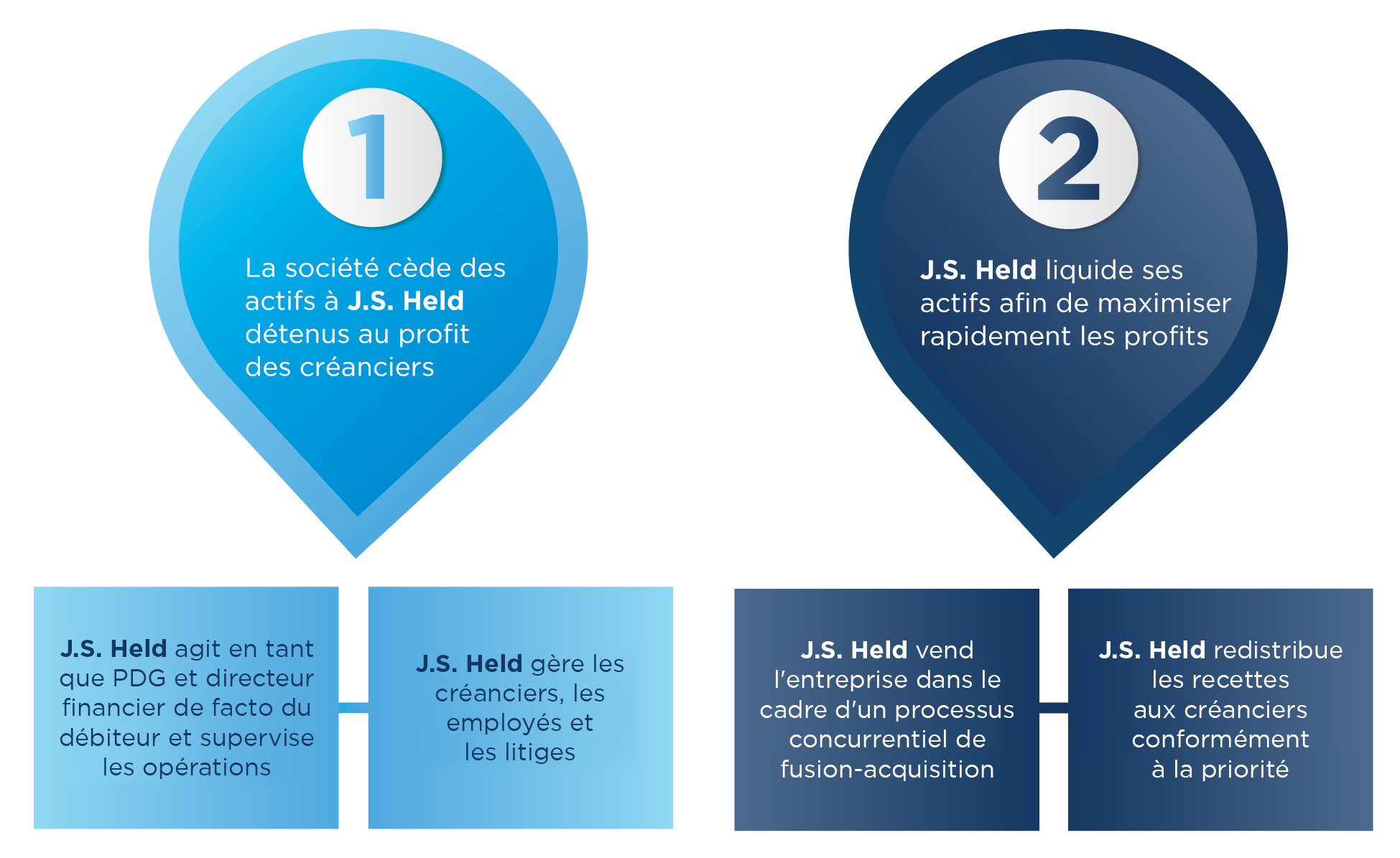 Notre équipe assume de facto les fonctions de PDG et de directeur financier de l'entreprise en difficulté, en prenant le contrôle des opérations, en traitant avec les créanciers, les employés et les litiges, tout en préparant et en exécutant la vente des actifs de l'entreprise, puis en distribuant le produit de la vente aux créanciers selon leur ordre de priorité.